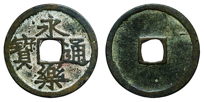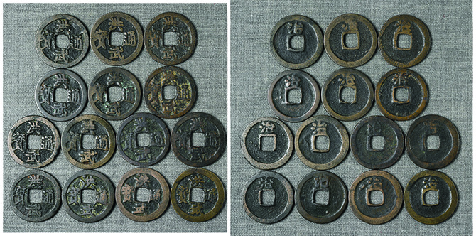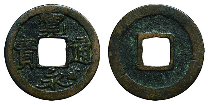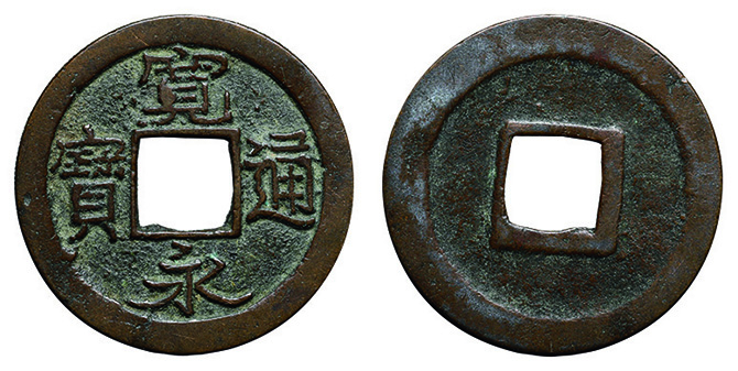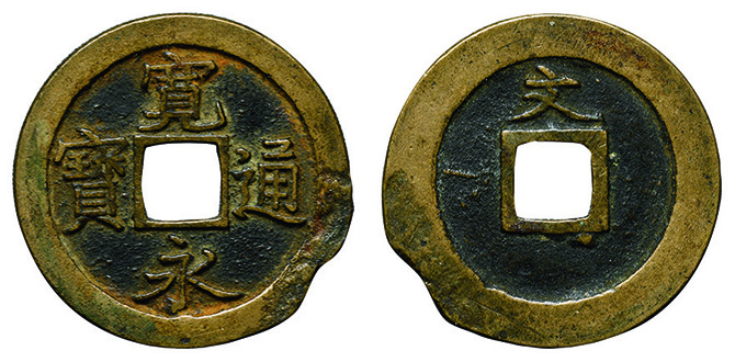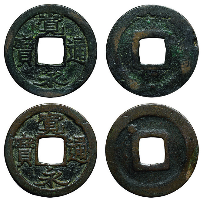6025 永楽通宝2枚組(明本銭、和鋳鐚 魚尾宝 24.0mm) 並~佳 5,000円