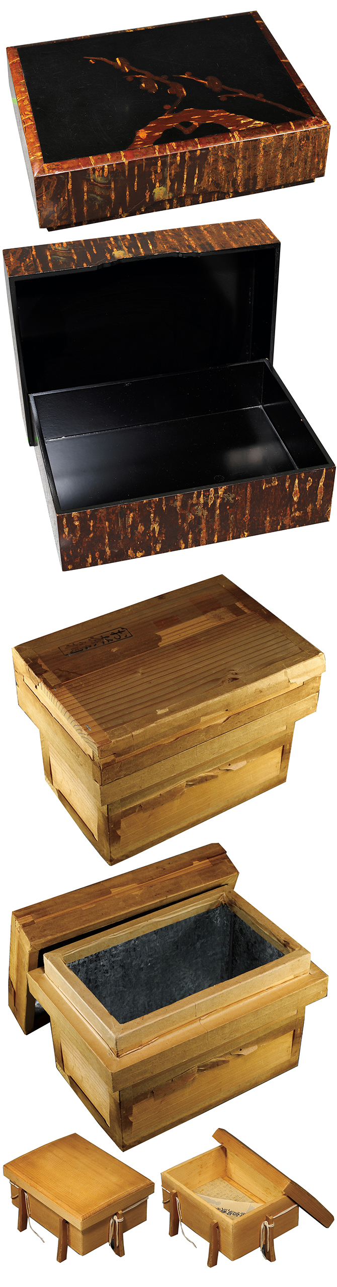 6419 高級品桜皮細工黒漆塗 30×22×高さ9cm、小型茶箱(小物保存用)内側トタン張り 22×16×高さ16cm、伊勢神宮下賜品櫃型小物入れ 14.5×11×高さ8cm 昭和4年の遷宮時に木曽檜の残材を用いた関係者配布品。説明書付、紙外箱破損。 美 2,000円
