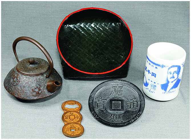 6425 南部鉄瓶急須 茶こし付 直百五銖・文禄通宝柄 14×12×高さ13cm、南部鉄器 茶托(慶応通宝) 11.3cm、栓抜き(共箱) 11.3cm、寿司屋用大型湯呑み 8×高さ11cm 十和田市新券発行記念関係品 共箱付、銭皿 竹籠黒漆塗 計5点組 美 3,000円