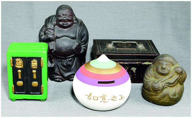 6426 戦前貯金箱 本所銀行鉄製手提金庫型 鍵付 13×高さ6.5cm、戦前貯金箱 陶製 置金庫型 高さ10cm、戦前貯金箱 座り大黒天 陶製 高さ8cm、戦前貯金箱 陶製 布袋 高さ15cm、宝珠貯金玉 陶製 尼信世界の貯金箱博物館製 10×高さ9.5cm 共箱付 計5点組 上~美 5,000円