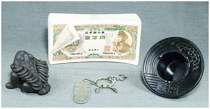 6427 金属製5円玉灰皿 径10cm、陶製1万円札貯金箱 幅16cm、土鈴置物 3本足銭負い蛙 作家物「泥山」在銘 横8×高さ6cm、石見銀山古丁銀型キーホルダー 世界遺産指定時の記念品 計4点 美 2,000円
