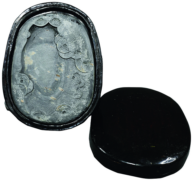 6433 中国古銭硯 箱とも縦24×横16.5×厚さ4cm 硯のみ縦18×横13×厚さ1.5cm 硯収納箱も硯と共に端渓石で製作し、清朝期の製作。硯背面に「道光丙午子貞研」と彫り込み有。付属品として筆洗、墨池、水滴3個(染付・青磁・備前)。返品不可。 美 83,000円