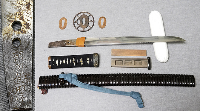 6436 本身入銭刀拵 拵全長55cm 鞘後部小尻に分金3枚が2段で6枚入る仕組み。稀少タイプ。拵:黒糸巻柄、千段刻み黒鞘、尾張透鐔、銅製2重ハバキ 古竹小柄付 高級品。本身:長さ27.8cm 反り0.1cm(短刀)「相州住助次 八月吉日」在銘 目くぎ穴2個 刀剣類登録証付(所有者変更届出書用紙付) 美 120,000円