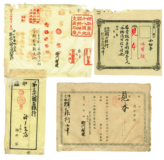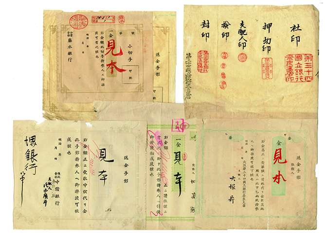 6450 大阪第34国立銀行奈良支店 印鑑見合帳、送金手形、中備銀行倉敷支店送金手形見本、藤本銀行小切手見本、加賀銀行送金手形見本 計5点組 上 5,000円