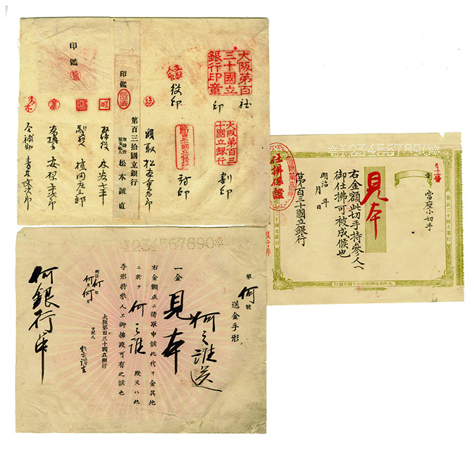 6449 大阪第130国立銀行印鑑見合帳、当座小切手見本、送金手形見本 計3点組 上 5,000円