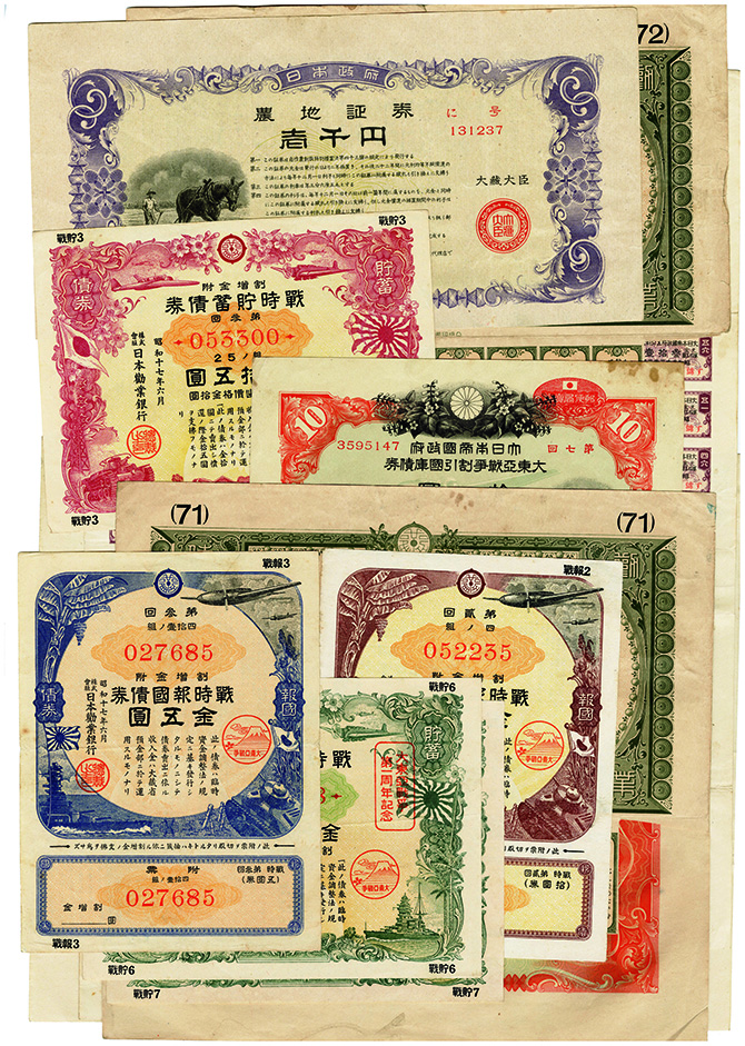 6451 戦時債券類 全27枚組(支那事変行賞 賜金国庫債券[大拾円・二百円]利札各16枚、大東亜戦争国庫債券 五拾円 利札22枚、支那事変割引・大東亜戦争割引 各国庫債券拾圓、大東亜戦争割引国庫債券[拾円、弐拾円、参拾円、五拾円]、特別報国債券4色[特1、特4、特8、特13]、福票3枚[1・2・3]、戦時郵便切手2種、報国債券[拾円]、戦時報国債券[五円、拾円]、貯蓄債券[拾五円]、戦時貯蓄債券[参拾円、拾五円2種、七円五拾銭2種] 並~美 5,000円