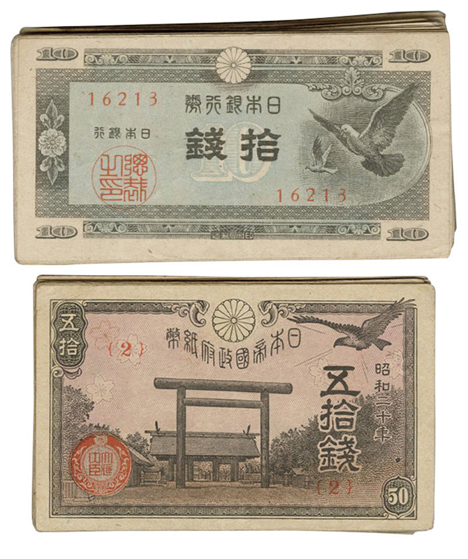 4057 昭和小額紙幣200枚組(鳩10銭 100枚、靖国50銭 100枚) 上~美 4,000円
