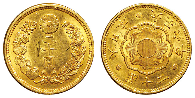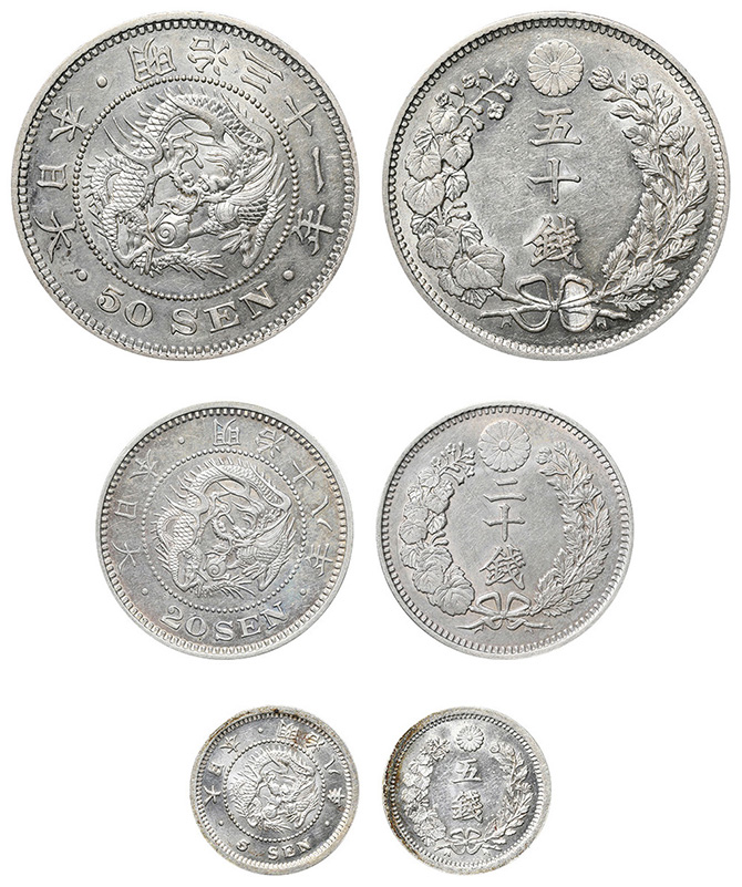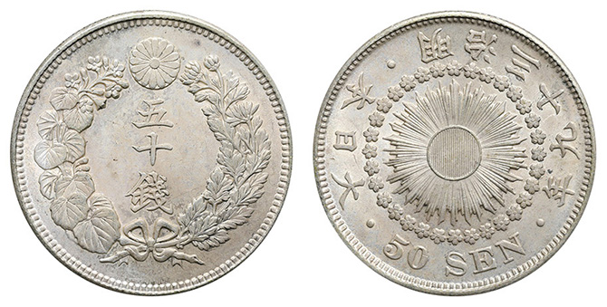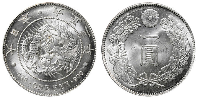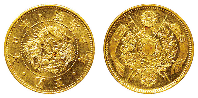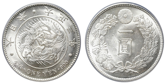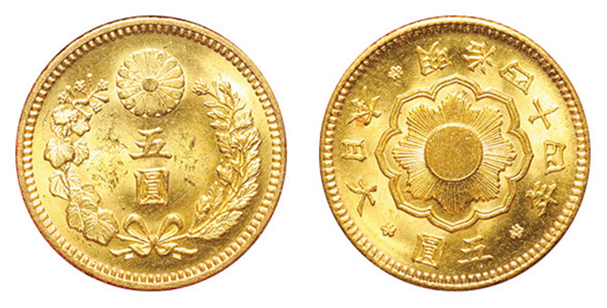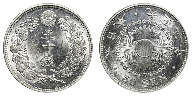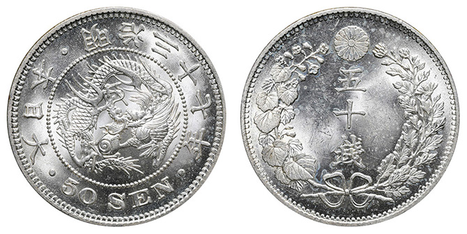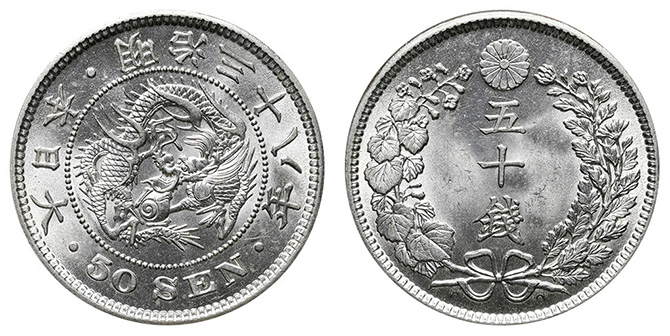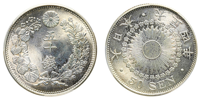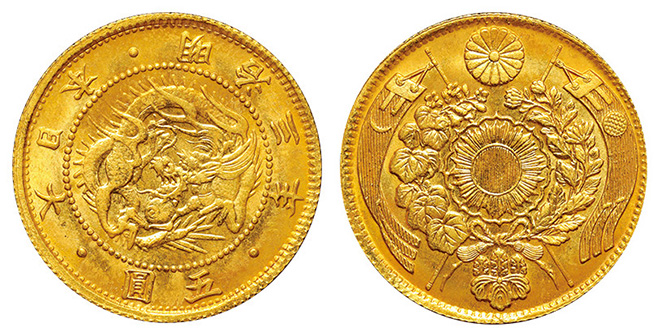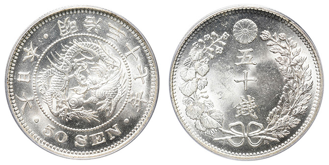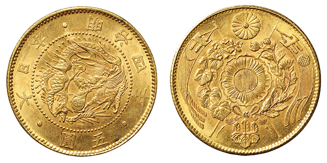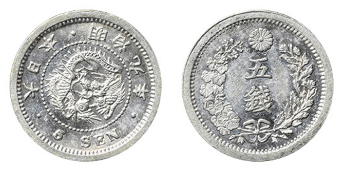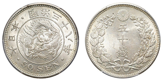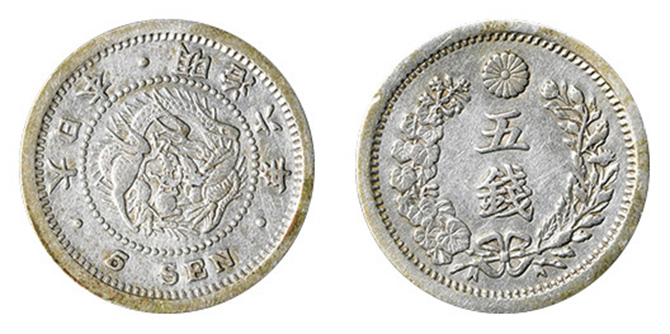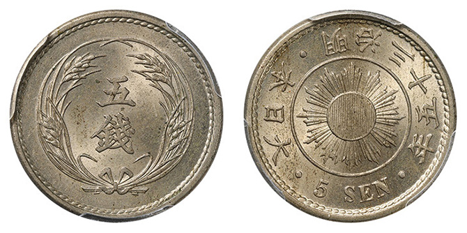 4398 稲5銭白銅貨 明治35年 PCGS(MS64) 少汚れ 未 30,000円