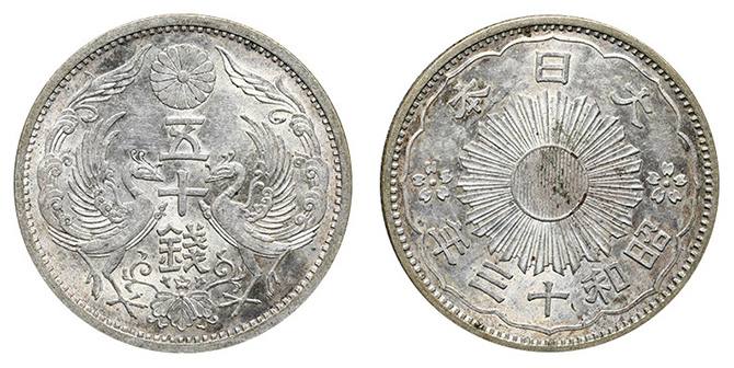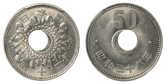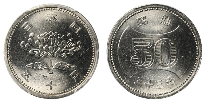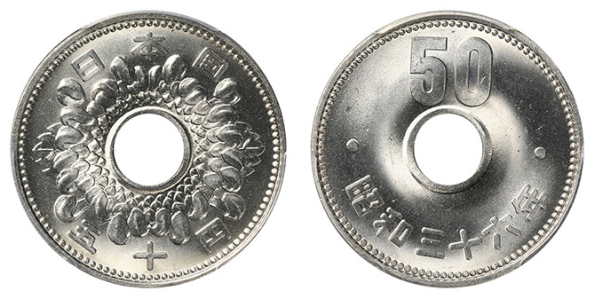 4447 50円ニッケル貨 昭和38年 穴ズレエラー PCGS(MS63) 準未~未 20,000円