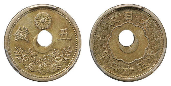 4399 小型5銭白銅貨 大正12年 穴ズレ PCGS(MS62 Mint Error) 極美 12,000円