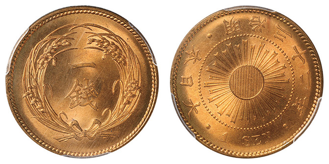 4414 稲1銭青銅貨 明治32年 PCGS(MS66RD) 未+ 16,000円
