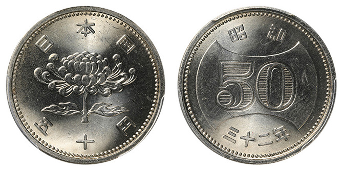 4441 穴無50円ニッケル貨 昭和32年 PCGS(MS65) 未 5,000円