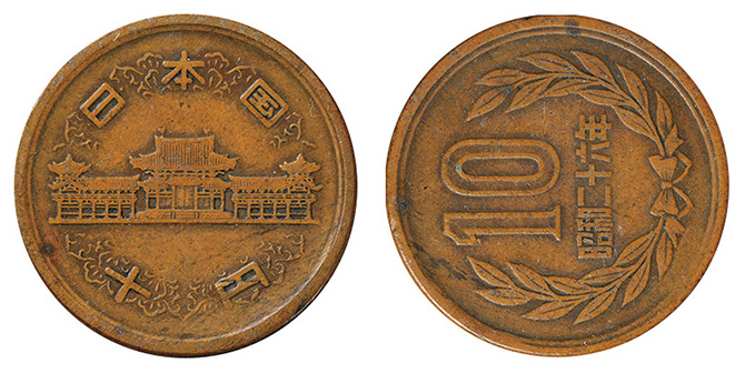 4457 10円青銅貨 昭和26年 約90度傾打 佳 5,000円