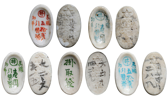 4494 函館丸井今井 陶製切手(商品券) 5個組(掛取袋[緑]、壱円[緑・青]、五拾銭[赤・青]) 佳~美 6,000円