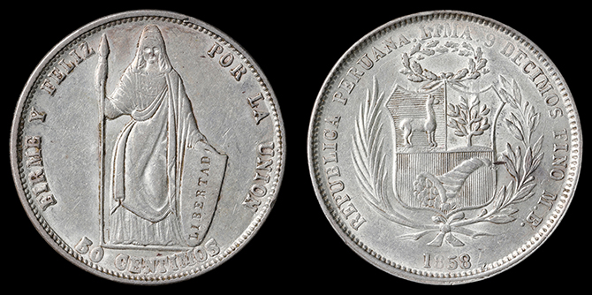 3005 ペルー 50C銀 1858 KM178 女神立像 極美 12,000円
