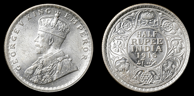 3078 英領インド 1/2R銀 1916 KM522 ジョージ5世 未 5,000円