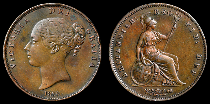 3229 英国 1P銅 1855 KM739 美~極美 12,000円