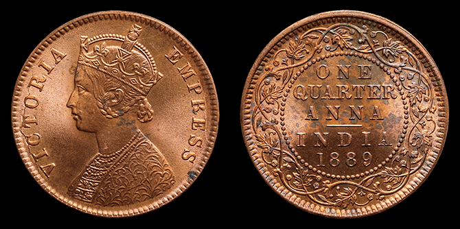 3138 インド 1/4A銅 1889 KM486 少変色 未 5,000円