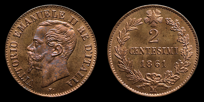 3142 イタリア 2C銅 1861M KM2.1 準未~未 8,000円