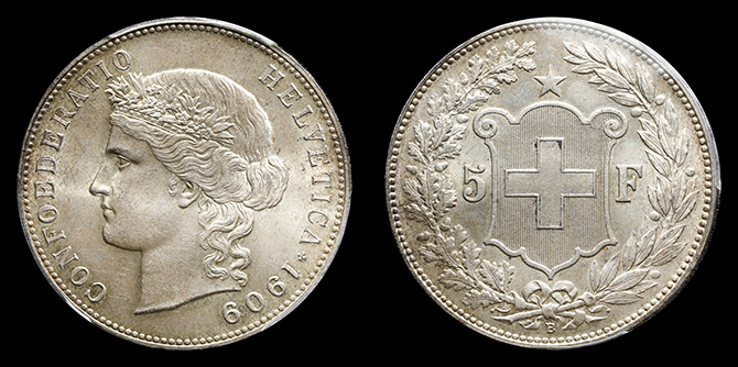 3185 スイス 5F銀 1909 KM34 PCGS(MS64) 少トーン 未+ 220,000円