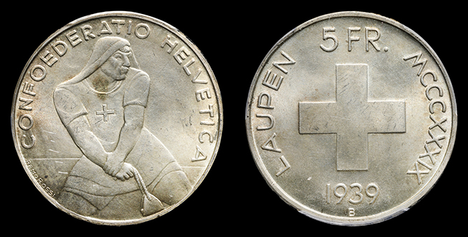 3186 スイス 5F銀 1939 KM42 PCGS(MS64) 未 48,000円