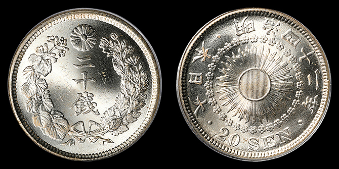 300 旭日20銭 明治42年 PCGS(MS65) 未〜完未 16,500円